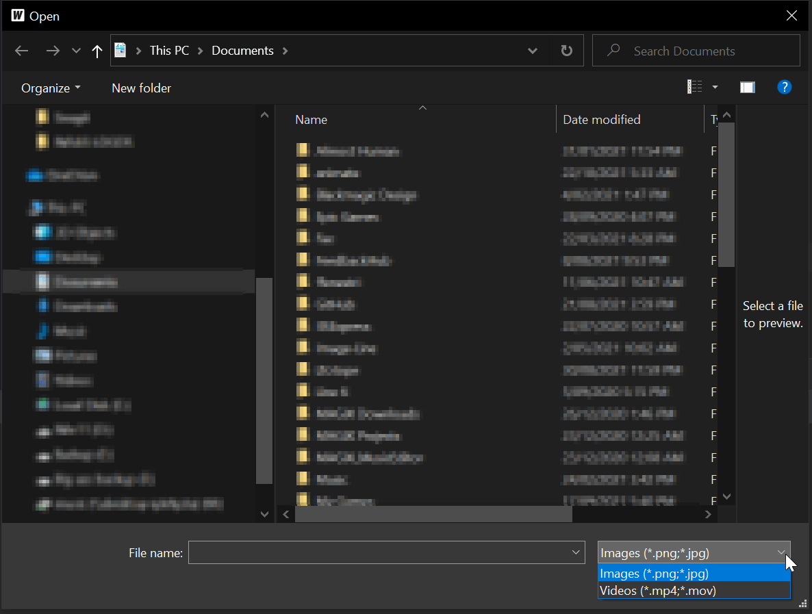 This will result in the Open File dialog using *.png,*.jpg,*.mov,*.mp4 as a filter.